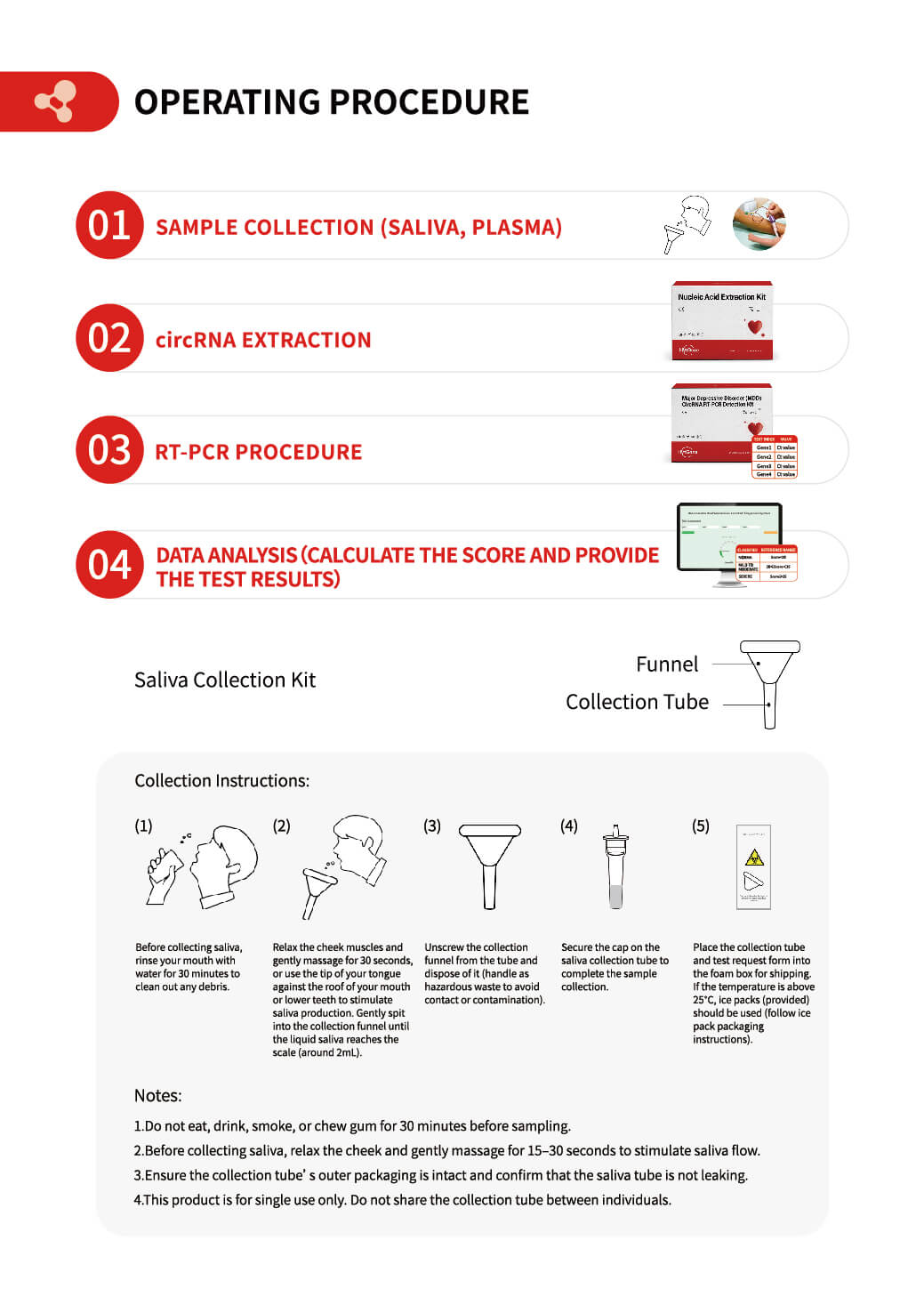 Enjuague la boca con agua limpia 30 minutos antes de la recolección (se prohíbe recolectar inmediatamente después), presione la punta de la lengua contra la raíz de los dientes maxilares o mandibulares para enriquecer la saliva y escupa suavemente la saliva en el embudo ovalado hasta que la saliva líquida (sin burbujas) alcance la línea de llenado de 2 ml. Desenrosque con cuidado el embudo del tubo de recolección (preste atención a que el tubo de recolección se mantenga en posición vertical durante el uso). Apriete la tapa roja y selle el tubo de recolección. Verifique que el tubo de recolección de muestra esté en buen estado y que no haya ningún desbordamiento de muestra, como un tubo agrietado o una tapa abierta. Deseche el embudo usado.