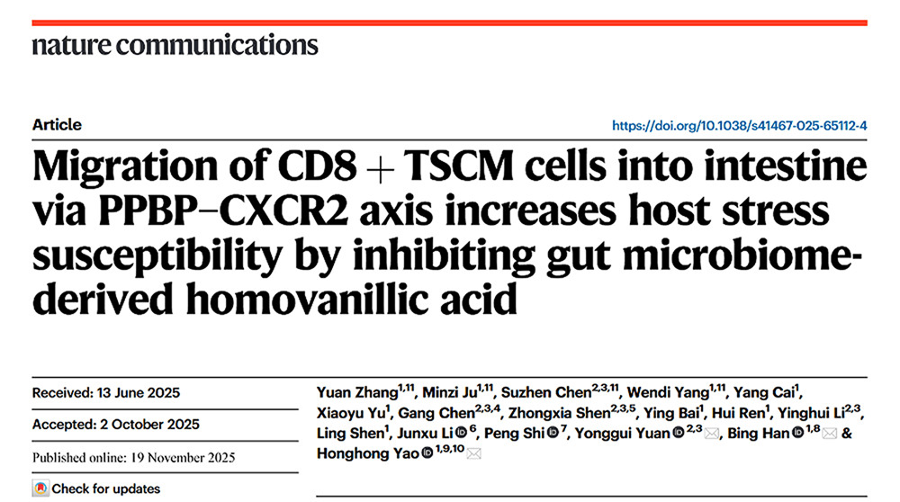 On November 19, 2025, the research group of Professors Yao Honghong and Han Bing from the School of Medicine of Southeast University, in collaboration with the team of Professor Yuan Yonggui from Zhongda Hospital Affiliated to Southeast University, The title "Migration of CD8+TSCM cells into intestine via PPBP-CXCR2 axis increases" was published online in Nature Communications with an IF of 16.6/Q1 The research article "host stress susceptibility by inhibiting gut microbiome-derived homovanillic acid" focuses on the cross-border regulation of CD8⁺T cell subsets and gut microbiota Attempt to solve the core mystery of the onset of depression.