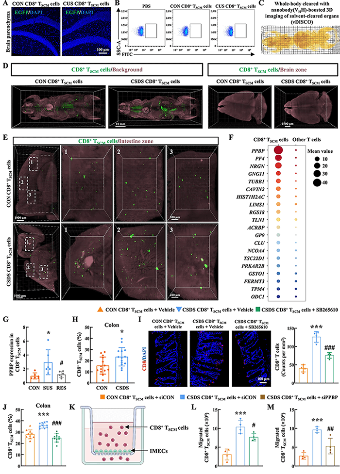 Subsequently, to track the in vivo migration trajectory of CD8+ TSCM cells, the research team employed an innovative vDISCO whole-body immune labeling imaging technique and unexpectedly discovered that these cells did not directly infiltrate the brain but instead migrated directionally to the intestine along the PPBP-CXCR2 axis. Mechanism studies have confirmed that platelet basic protein (PPBP), which is highly expressed in CD8+ TSCM cells, binds to its receptor CXCR2 and is a key molecular pathway mediating cell migration to the intestine. This migration process can be significantly blocked through intervention with CXCR2 inhibitor SB265610 or PPBP gene silencing.